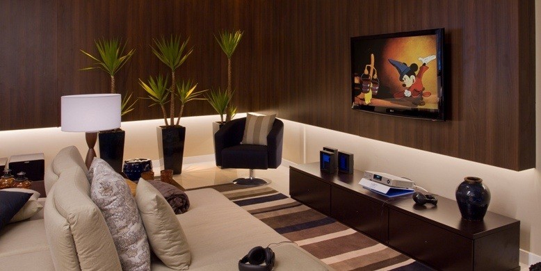 Além de serem bastante funcionais na hora de esconder imperfeições nas paredes e a fiação dos aparelhos de mídia, os painéis de madeira também promovem a sensação de conforto e quebram o aspecto frio dos ambientes.